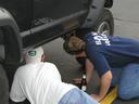 Steve and James fascinated by something on the underside of Steve's Jeep